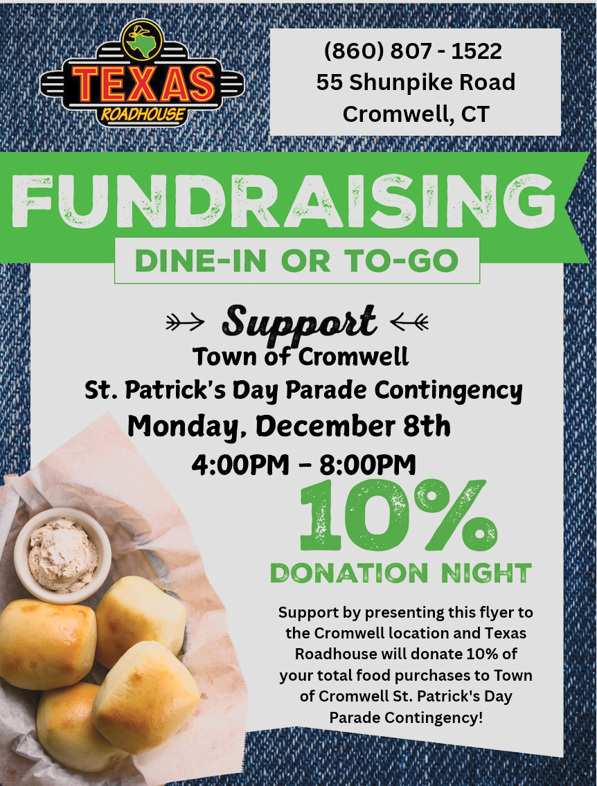 Texas Roadhouse will donate 10% of your total food purchase to the Town of Cromwell St. Patrick's Day Parade Contingency